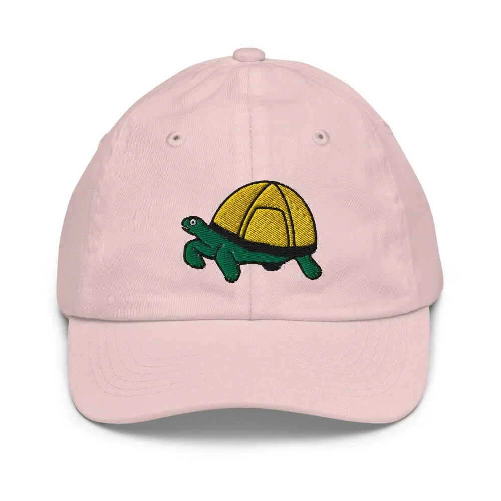 Cute youth hat featuring a turtle with a tent that’s perfect to take on a camping trip. It’s a great gift for any kid who loves the outdoors. Constructed with a pre-curved visor, the hat keeps the sun out of the eyes. Adjustable strap closure and 6 eyelets allow for a great fit and comfortable wear all day long. Cap comes in Navy or Pink